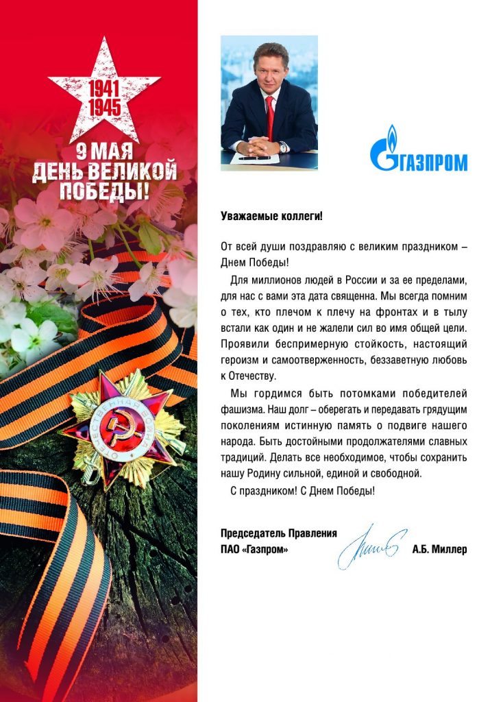Председатель Правления ПАО "Газпром" А.Б. Миллер: «Мы гордимся быть потомками победителей фашизма»