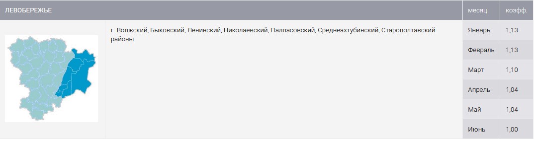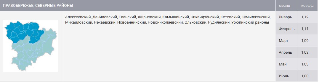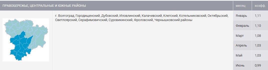 Для Волгоградской области температурные коэффициенты на 1-е полугодие 2025 года установлены по следующим климатическим зонам: