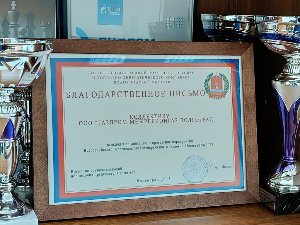 Волгоградских газовиков поблагодарили за вклад в организацию и проведение мероприятий по энергосбережению и экологии